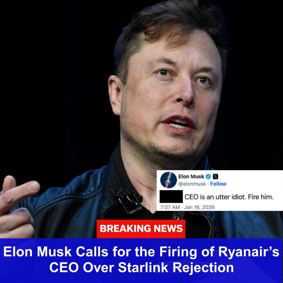 The dispute between Elon Musk and the leadership of Ryanair has unexpectedly escalated into a public war of words, centered on the airline’s decision to reject the installation of Starlink satellite Wi-Fi on its aircraft. Tensions peaked when Musk openly called for the dismissal of Ryanair’s CEO, Michael O’Leary, following blunt remarks criticizing Starlink and its suitability for commercial aviation.